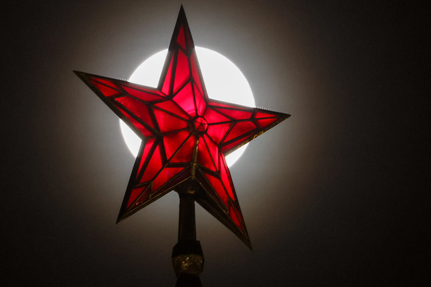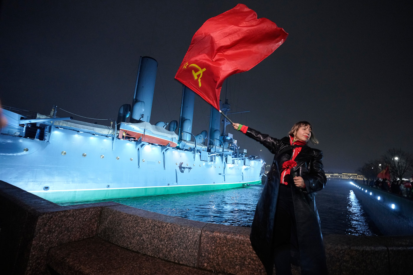 Женщина размахивает советским флагом у крейсера «Аврора» в Санкт-Петербурге 7 ноября 2025 года. В этот день в СССР отмечали годовщину Октябрьской революции. Сигналом к ее началу осенью 1917 года стал залп из орудия на носу «Авроры»