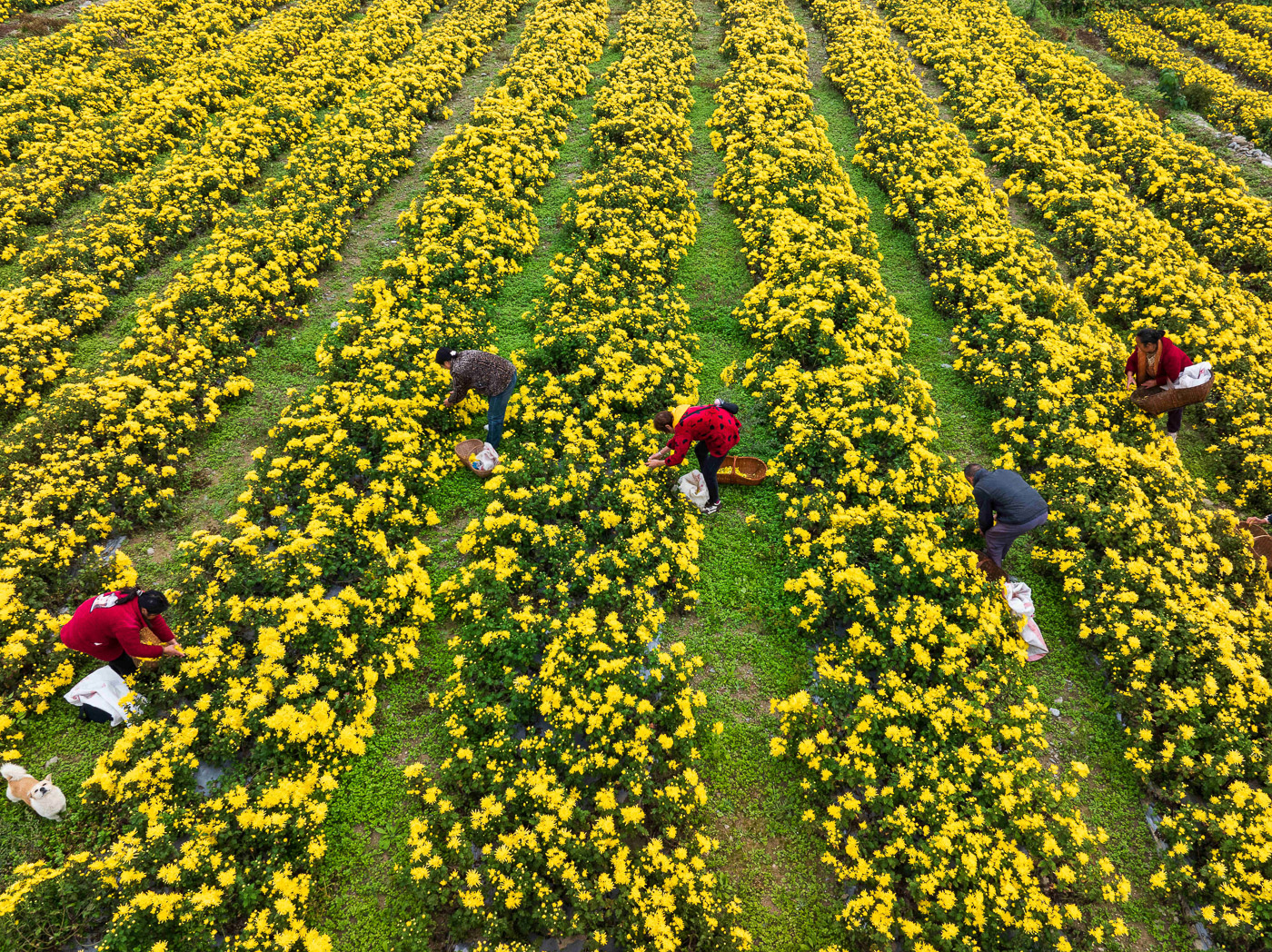 Местные жители собирают хризантемы во время осеннего сезона сбора урожая в городе Сянъян, провинция Хубэй, Китай
