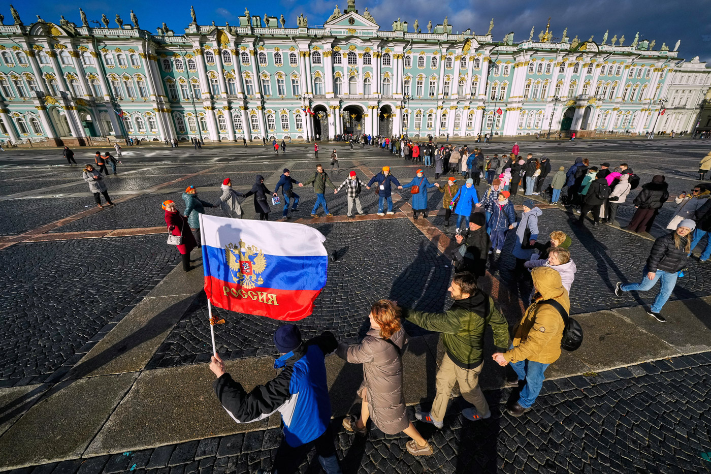 Люди водят хоровод в честь Дня народного единства на Дворцовой площади в Санкт-Петербурге