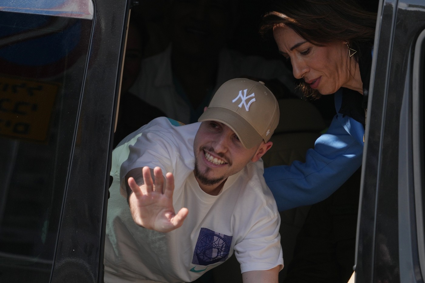 Алон Охель машет рукой из фургона по прибытии в больницу Бейлинсон в Петах-Тикве
