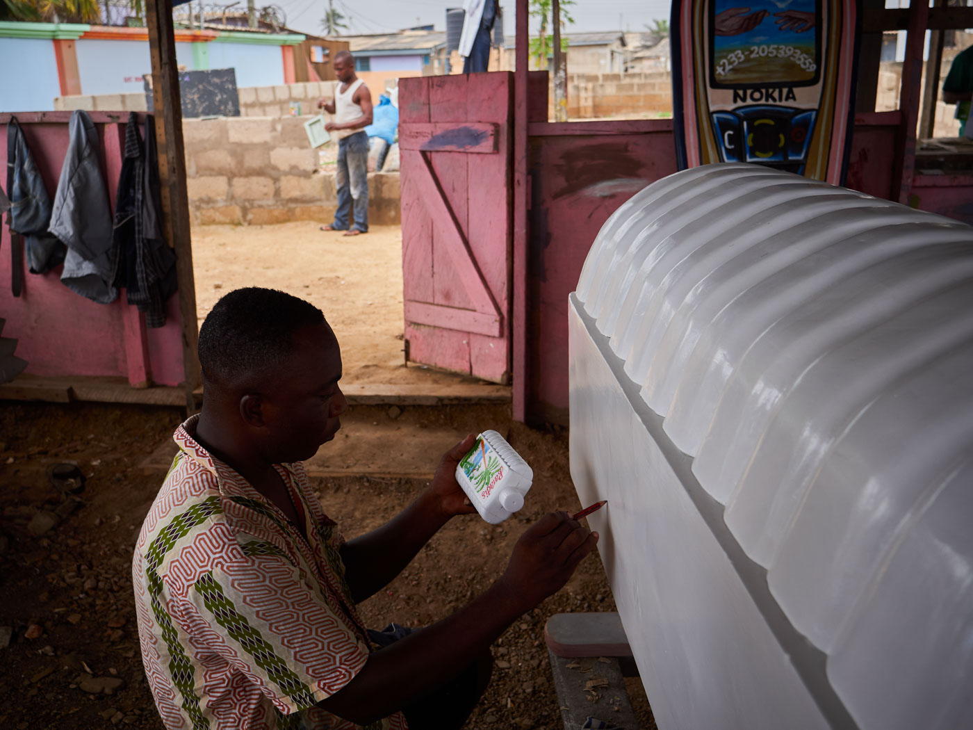 Художник Джозеф переносит изображение с упаковки талька на гроб, выполненный в виде её копии, который они изготовили для Флоренс, покойной торговки тальком, Аккра, Гана, 1 июля 2019 года