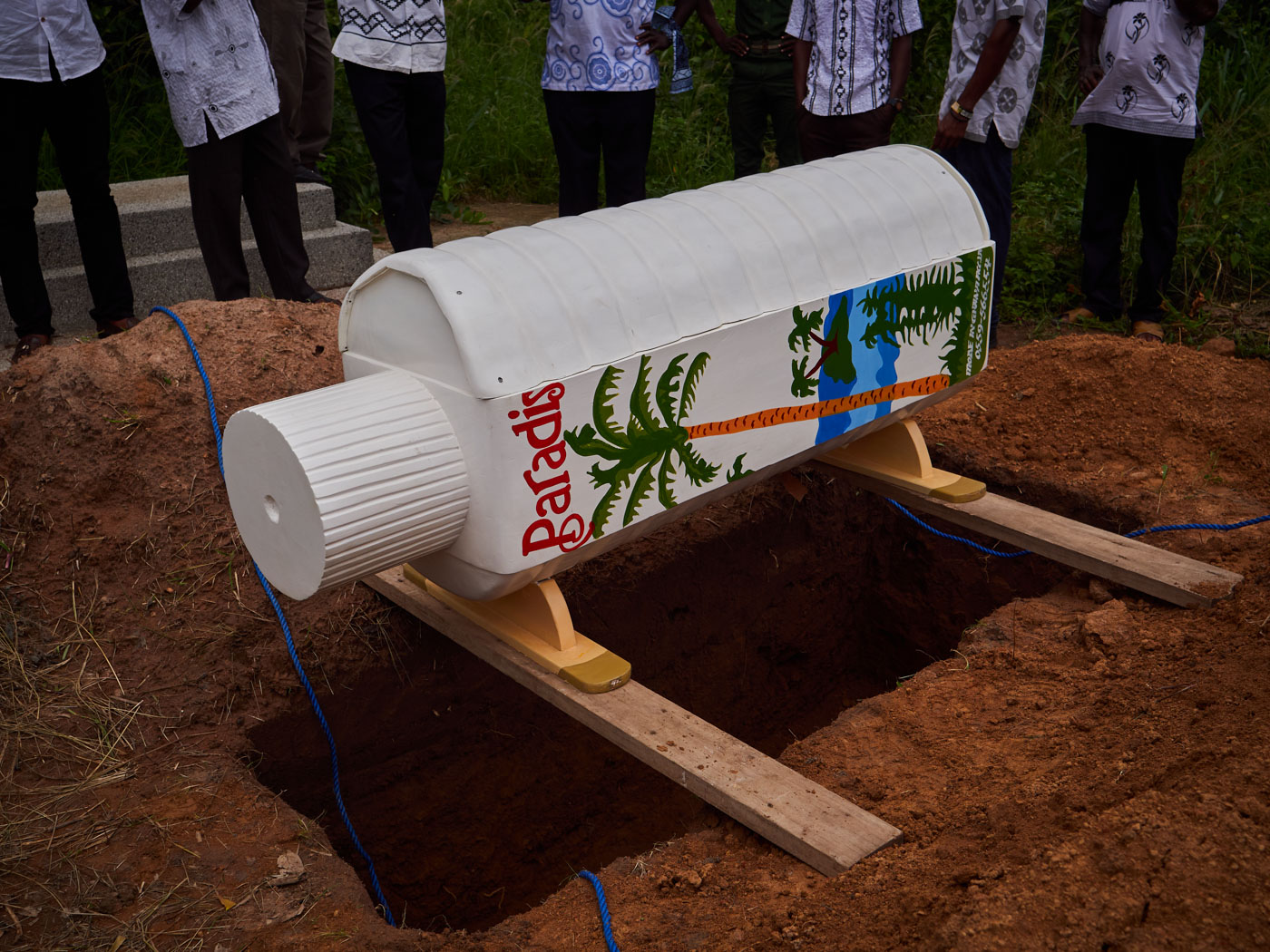Фантазийный гроб покойной Флоренс Аквели Тетте (47 лет), торговки тальком, установлен над могилой, в которой она будет похоронена для проведения заключительных похоронных обрядов, Аккра, Гана, 6 июля 2019 года