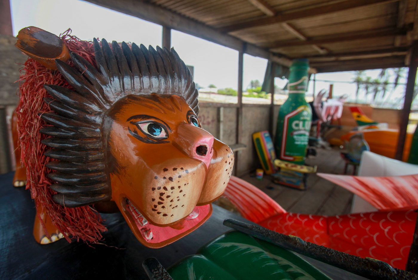 В мастерской по изготовлению гробов выставлен гроб, сделанный в форме льва, Аккра, Гана, 27 января 2010 года