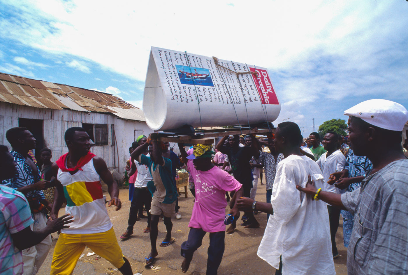 Во время пути к кладбищу гроб в форме газеты вращают по кругу, чтобы дух покойного не смог найти дорогу обратно в свой старый дом, Гана, 27 декабря 2005 года