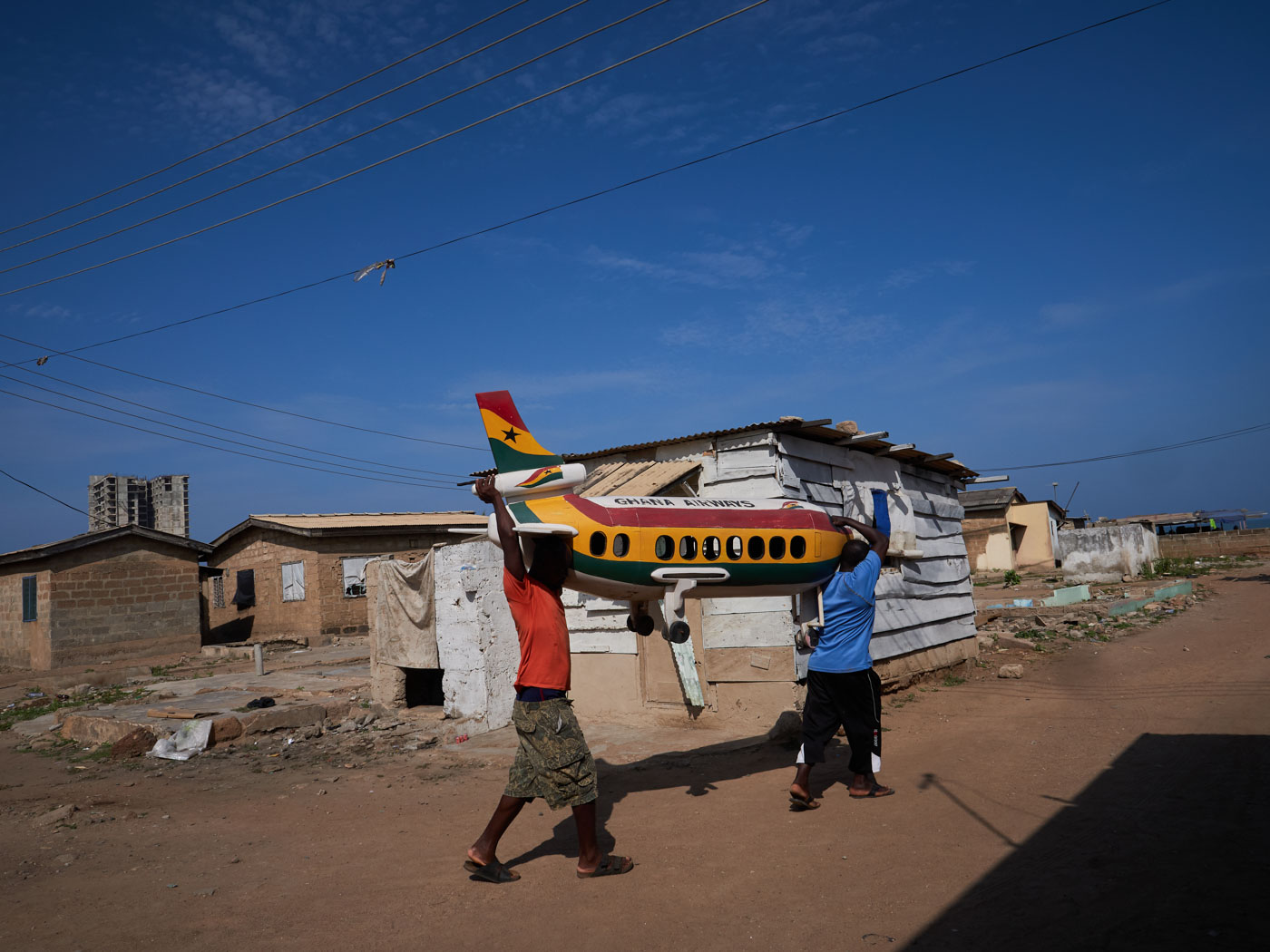 Ричард и Боркети несут фантазийный гроб в форме самолёта, символично названный в честь ганской авиакомпании Ghana Airways, Аккра, Гана, 21 июня 2019 года