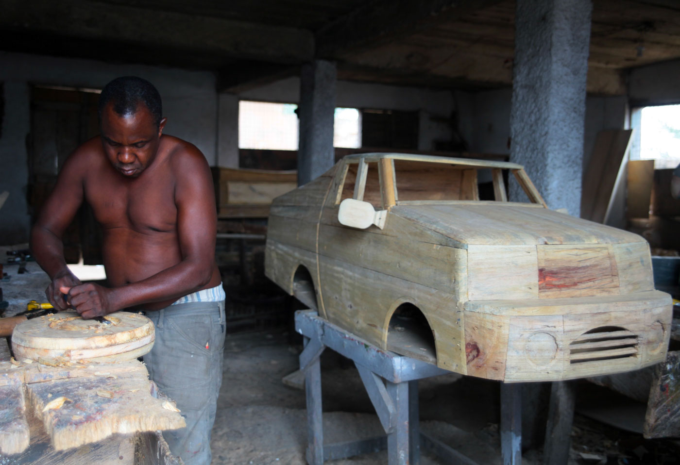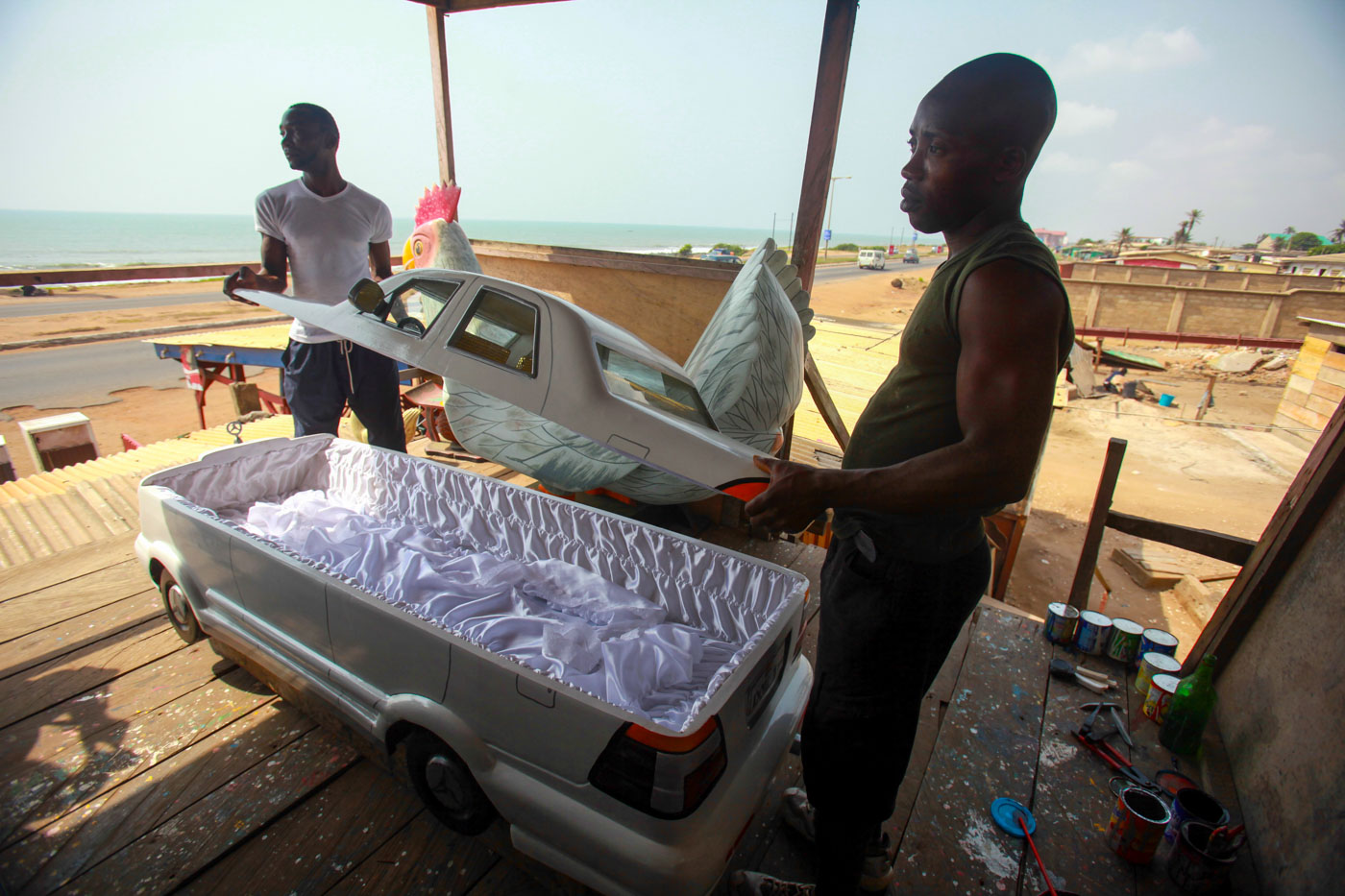 Мастера по изготовлению гробов показывают гроб, сделанный в форме автомобиля, Аккра, Гана, 27 января 2010 года