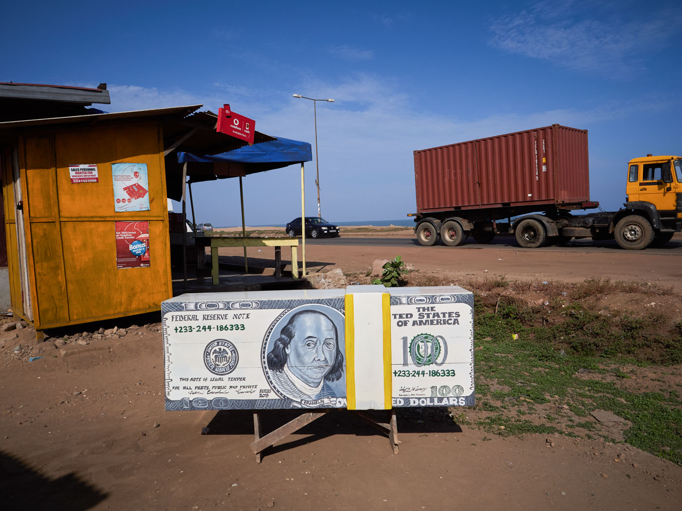 Фантазийный гроб в виде пачки долларовых банкнот, спроектированный Эриком Кпакпо Адотеем и раскрашенный Джозефом Аджетеем в Ла, Аккра, Гана, 21 июня 2019 года