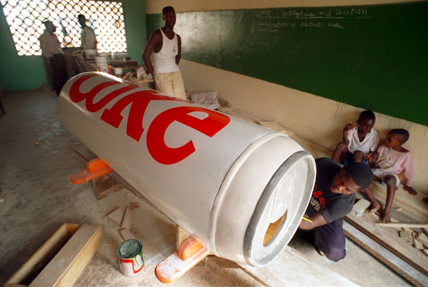 Помощник в мастерской Нии Анума наносит последние штрихи краски на гроб в форме банки Coke для Эрни Вулфа в мастерской Нии Анума в Теши, Гана, 31 марта 1995 года